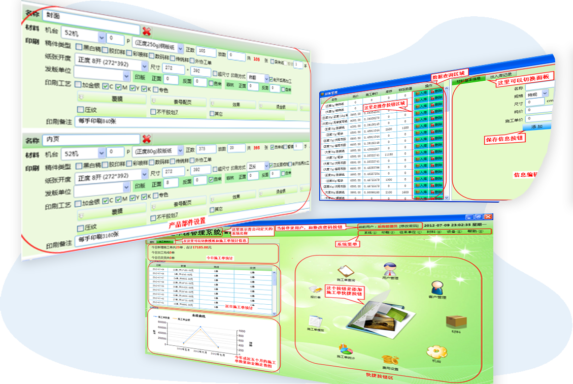- 可實現(xiàn)印刷流程無紙化管理,包括財務(wù)、機臺、銷售多端功能,數(shù)據(jù)自動流轉(zhuǎn)。